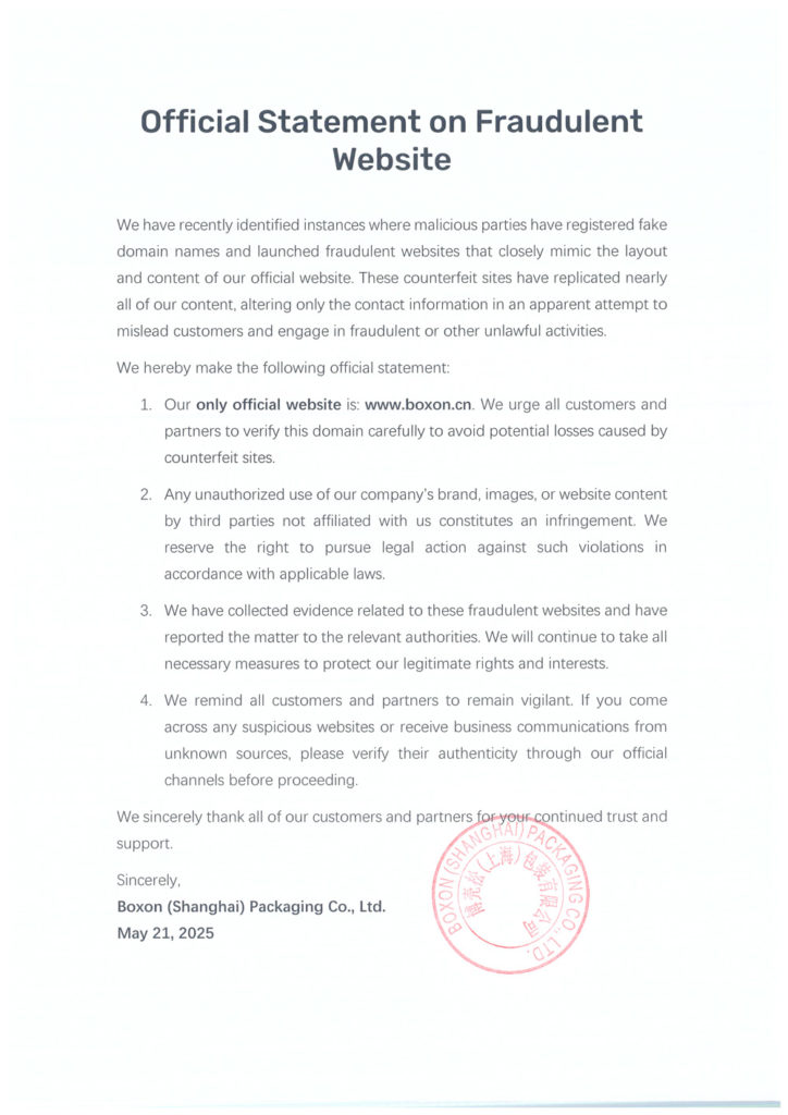 4.? We remind all customers and partners to remain vigilant. If you come across any suspicious websites or receive business communications from unknown sources, please verify their authenticity through our official channels before proceeding.