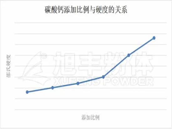經(jīng)測試,隨著碳酸鈣添加量的增加,膠粘劑整體的邵氏硬度提升不明顯,達到一定添加量后開始上升。故選擇合適的比例,可以使膠粘劑具有更好的硬度和性能。