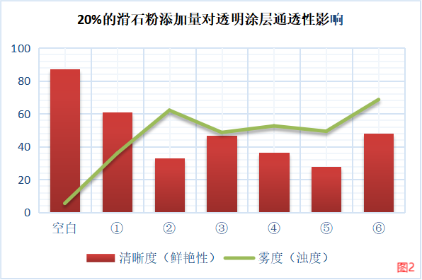 綜上①滑石粉具有明顯優(yōu)異于其他滑石粉的透明性,同時(shí)在高比例下仍可保持較優(yōu)異的清晰度和低霧度,可見(jiàn)①滑石粉為透明級(jí)滑石粉,比一般滑石粉更適用于如木器涂料的透明體系中。