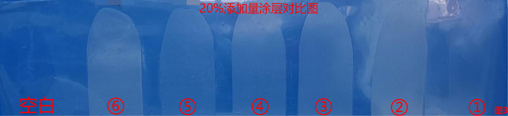 同時(shí)使用霧度儀ASTM標(biāo)準(zhǔn),測(cè)試400-700nm波長(zhǎng)下,添加20%滑石粉涂層的霧度(濁度)和清晰度(鮮艷性)如上圖2,①滑石粉在20%添加比例下仍可以保持較好的清晰度,對(duì)涂層的濁度外觀影響較??;整體的外觀情況如下圖3。